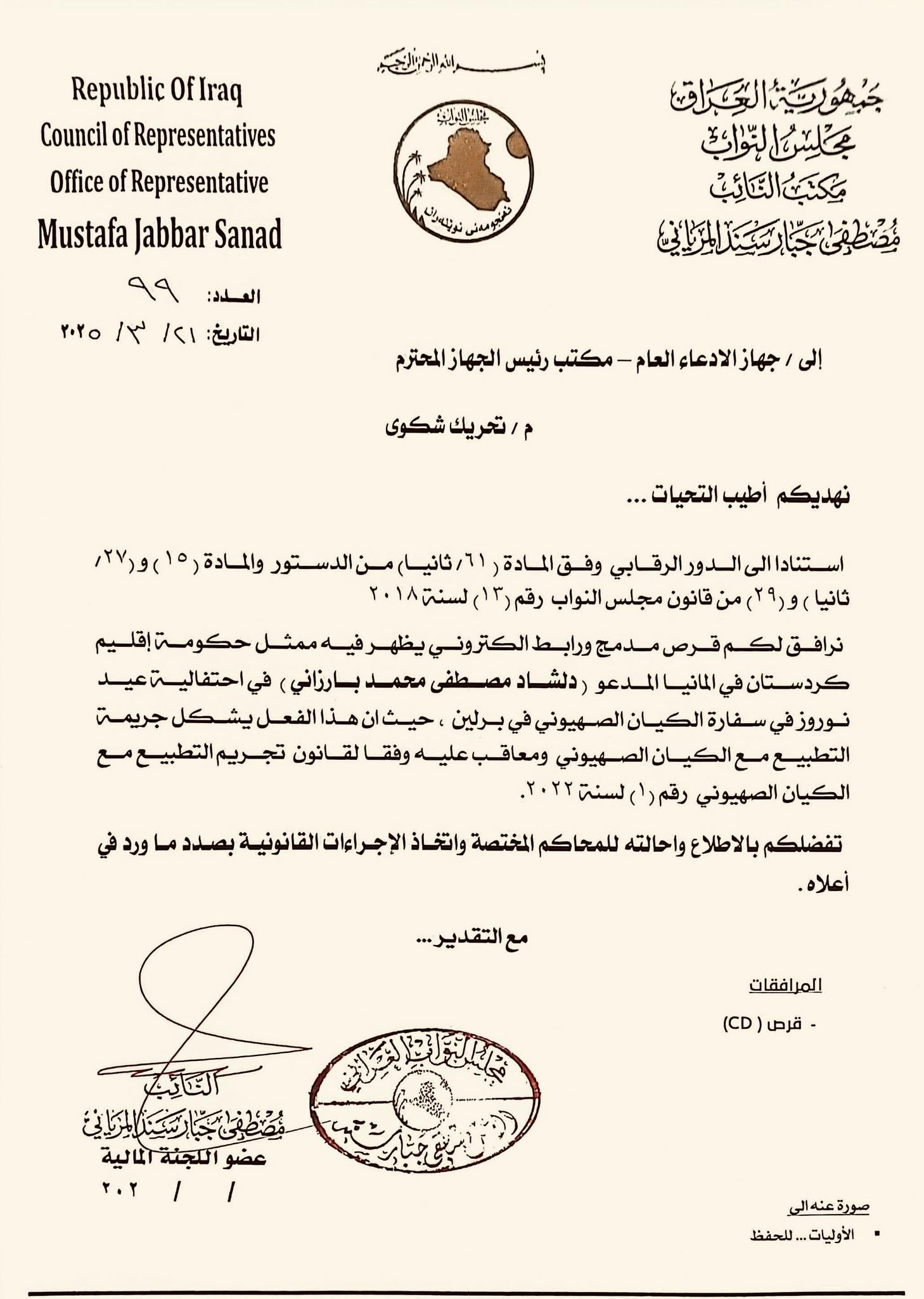 کردستان باس - بر اساس نامه رسمی مصطفی جبار سند (نماینده مجلس عراق) که روز جمعه ۱۴۰۴/۱/۱ به شماره ۹۹ به دادستانی کل ارائه گردید و در صفحه شخصی خود در شبکه اجتماعی فیسبوک منتشر نمود، به این موضوع اشاره شده که یک سی دی و یک لینک الکترونیکی دلشاد مصطفی محمد بارزانی (نماینده دولت اقلیم کردستان در آلمان) ارائه نمودیم که نشان میدهد دلشاد بارزانی در جشن نوروز سفارت اسرائیل در برلین شرکت کرده است.